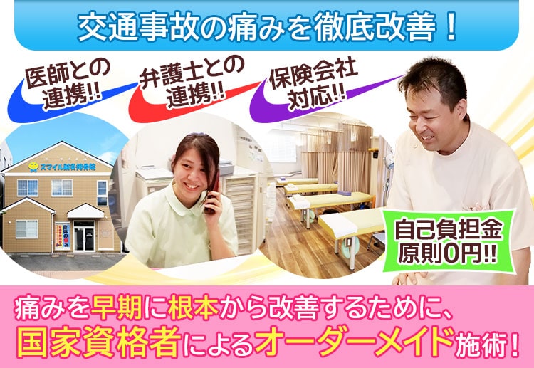 スマイル接骨院では、交通事故特有のケガに対して、きちんと原因を分析したうえで、手技や充実した施術機器による施術を受けることができます。