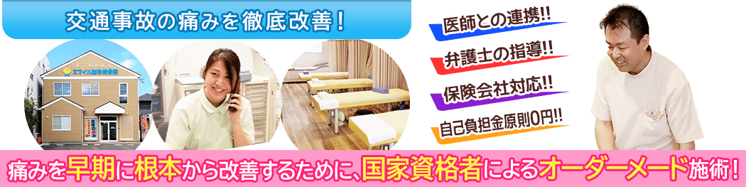 続きスマイル接骨院では、交通事故によるむち打ち症の施術を得意としています。